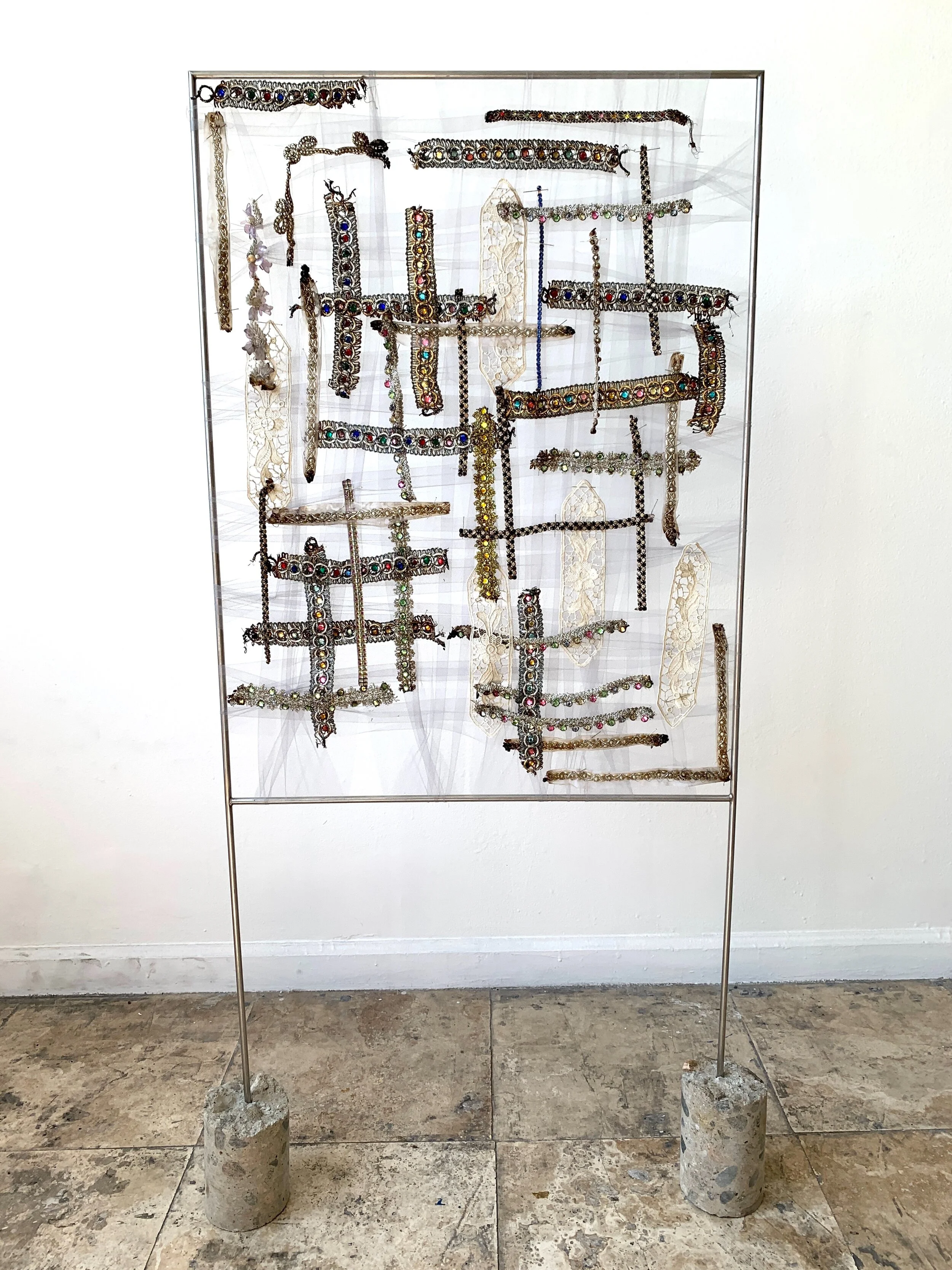 "in between", stainless steel, braid, lace, trim, tulle, pins, core sample, 51 x 28 x 4 inches (side A)
